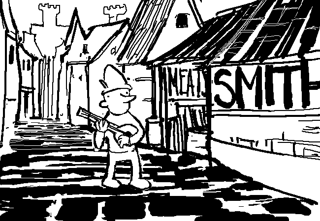 Ты бродишь по улицам города, готовясь к своему приключению. Ты задаёшься вопросом, не стоит ли запастись несколькими запасными мешками для драконьих трупов, так, на всякий случай. Но, наверно, тебе стоит начать с брони. Ты решаешь закупиться в лавке кузнеца.