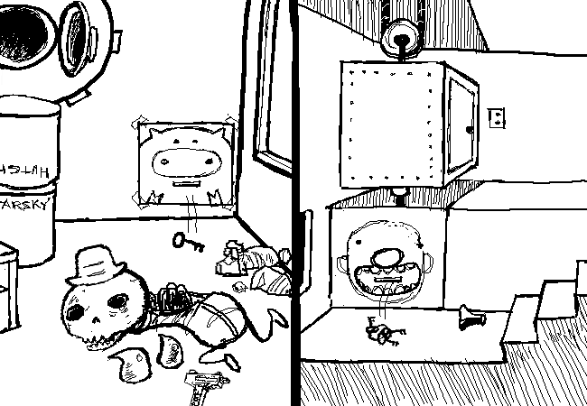 Бедовый Сыщик просовывает КЛЮЧ через щель в грузовом лифте.