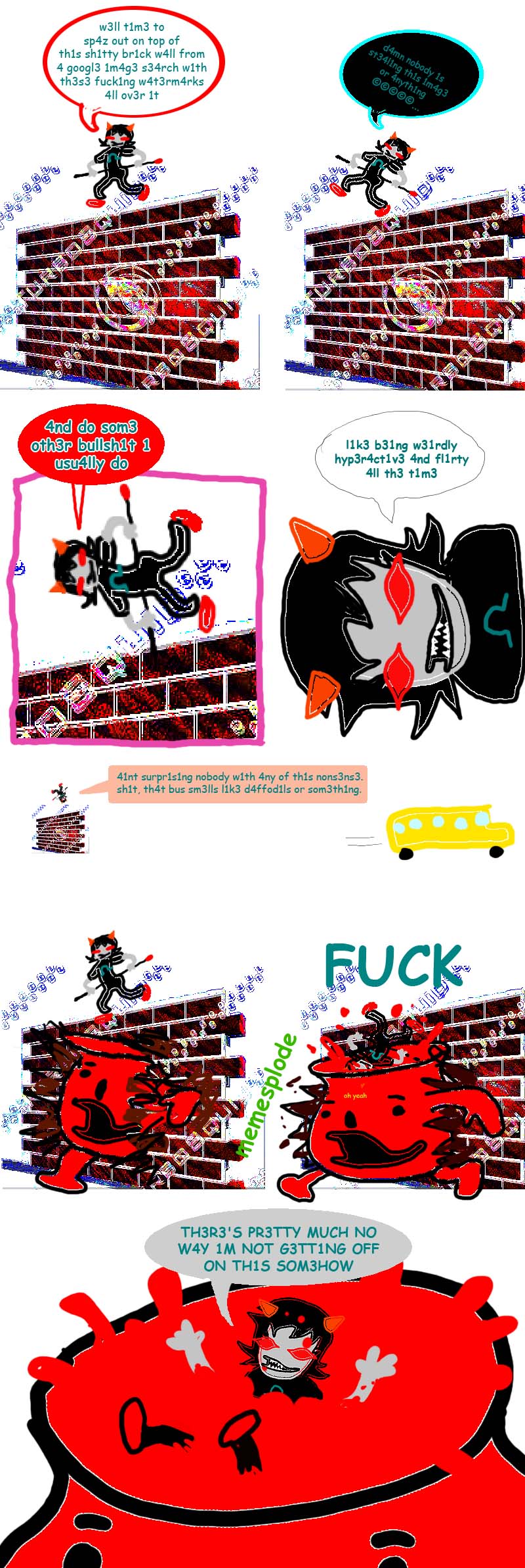 Последний пересказ, который я написал, был очень большим, да ещё и белыми чернилами, и там Джейд только-только вбросила своё мёртвое снобличие в Бекспрайта для прототипирования. Затем Джейдспрайт психанула и разрушила колонну, поддерживавшую лабораторию, и большой шар свалился и отскочил от дома, и скатился по снежному холму, и она начала плакать.